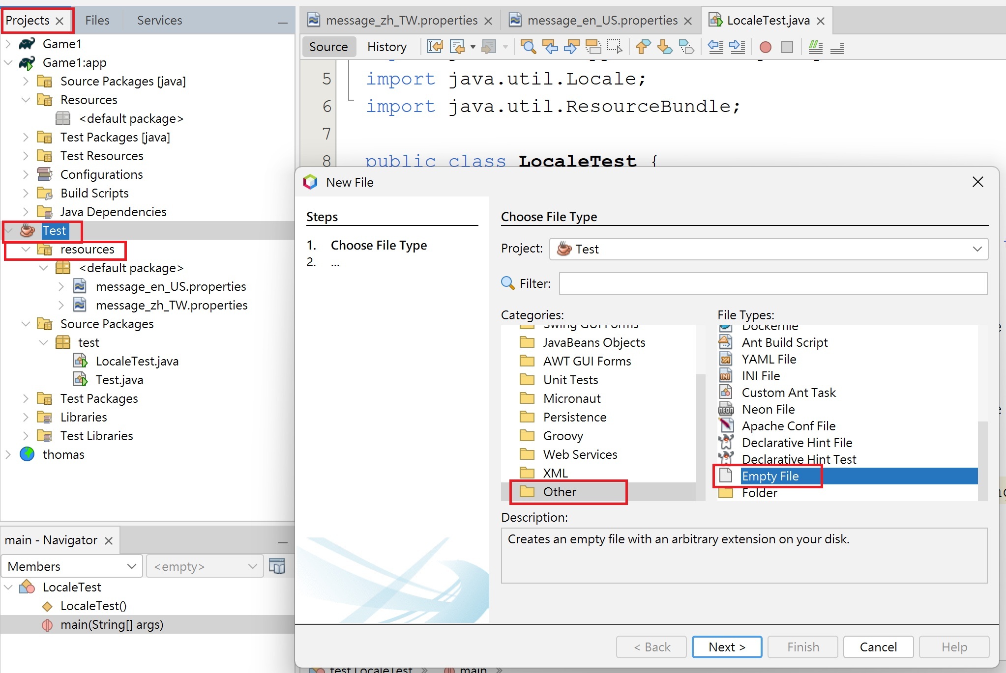 resources 按右鍵/other,再由彈出視窗中的 Other 選取 Empty file,分別建立檔名message_zh_TW.properties 及 message_en_US.properties。