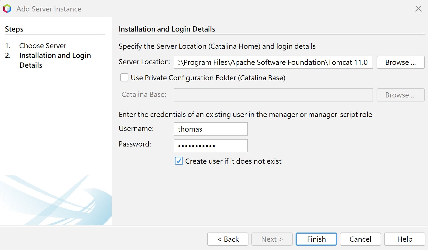 Server Location 選擇 C:\Program Files\Apache Software Foundation\Tomcat 11.0,Username/Password 填入 Tomcat 安裝時的帳號及密碼。