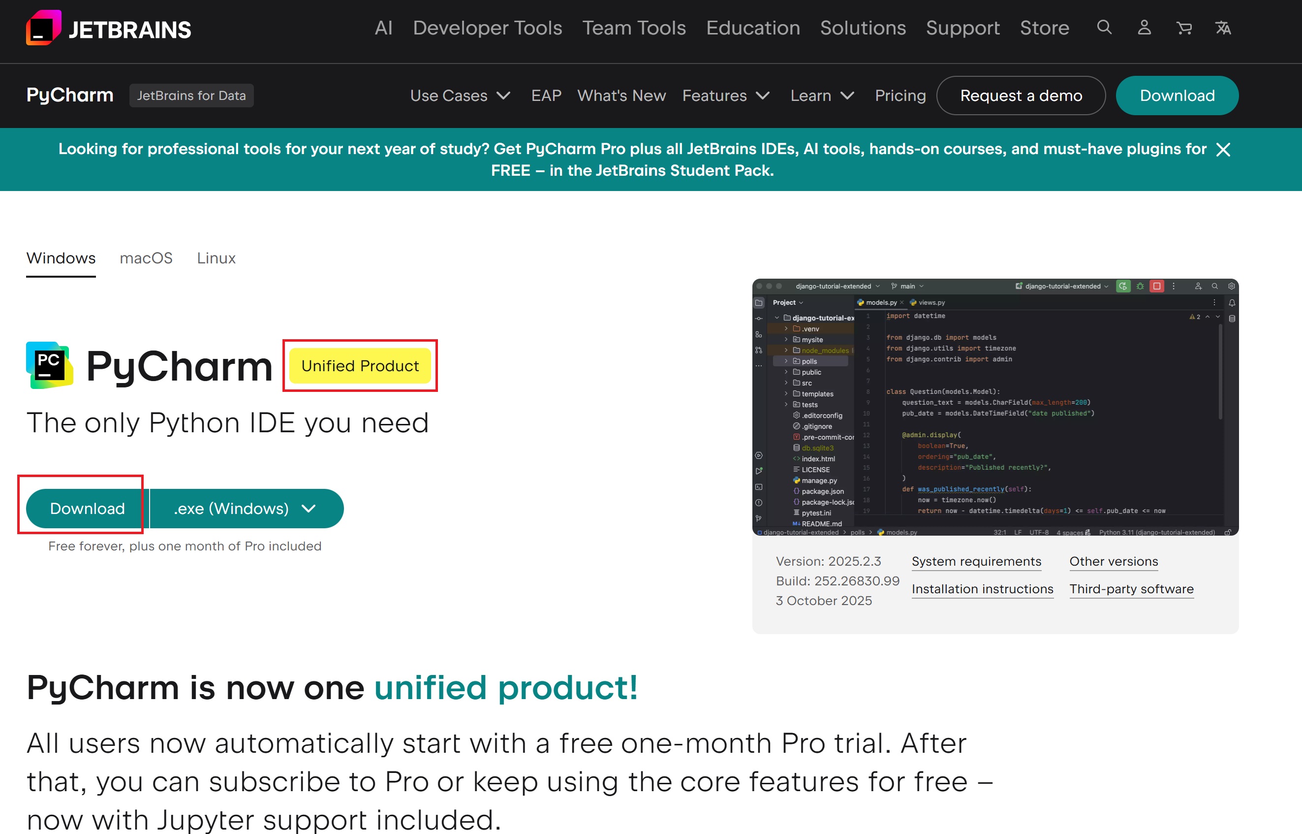 Pycharm 下載網址為 https://www.jetbrains.com/pycharm,進入後只有 Unified Product 統一版本。統一版本包含了免費的核心功能及 Professional 的試用版。30天過後,Professional 的功能就無法使用,Trial 的字樣也會消失。