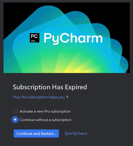 當 Trial 試用版 30 天到期後,請按下 “Continue without a subscription”,然後再按下 “Continue and Restarting” 即繼續使用 Community 的功能。